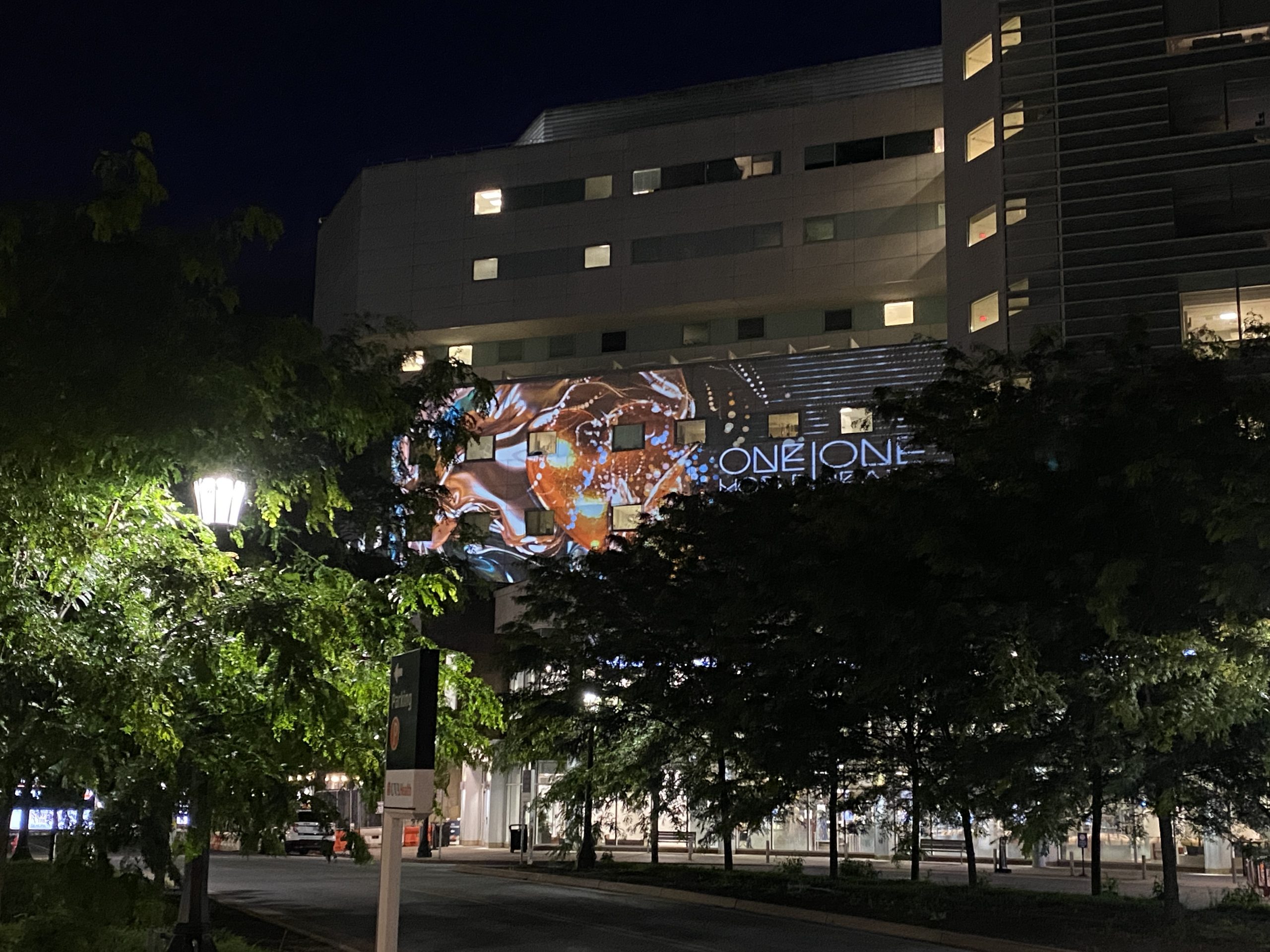 2 x 12K lumen Laser Projectors illuminated UVA Hospital and Sentara Martha Jefferson Hospital with animated art.